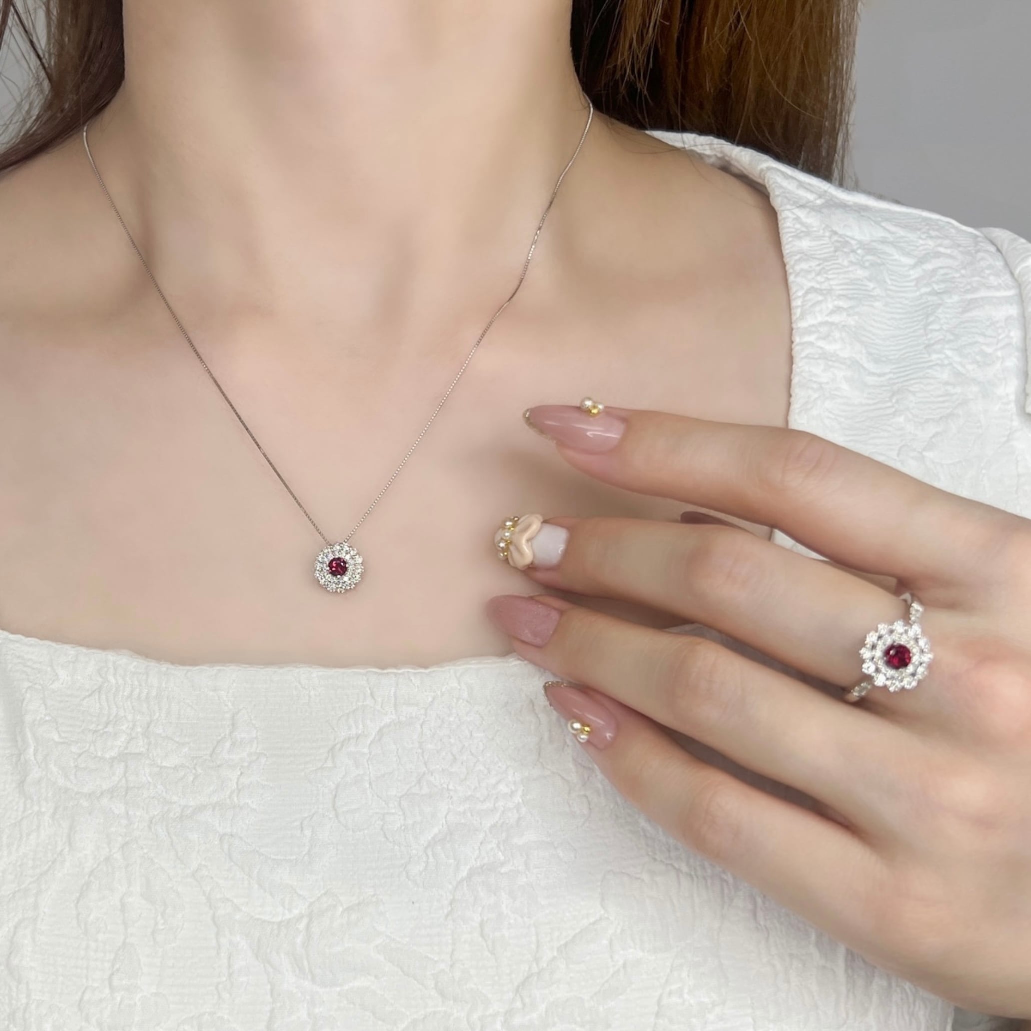 ルビーの鮮やかな赤が、純白のプラチナの輝きと調和し